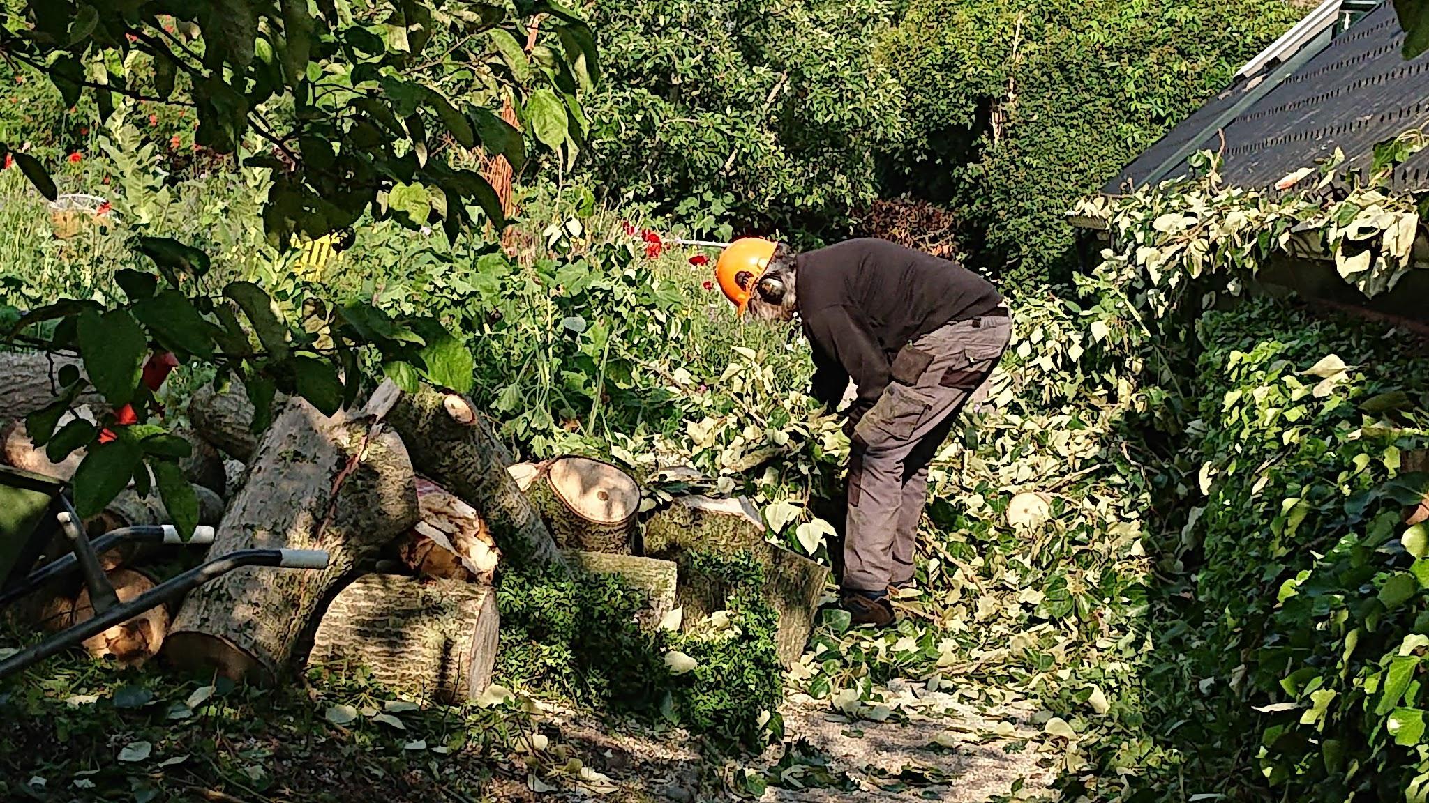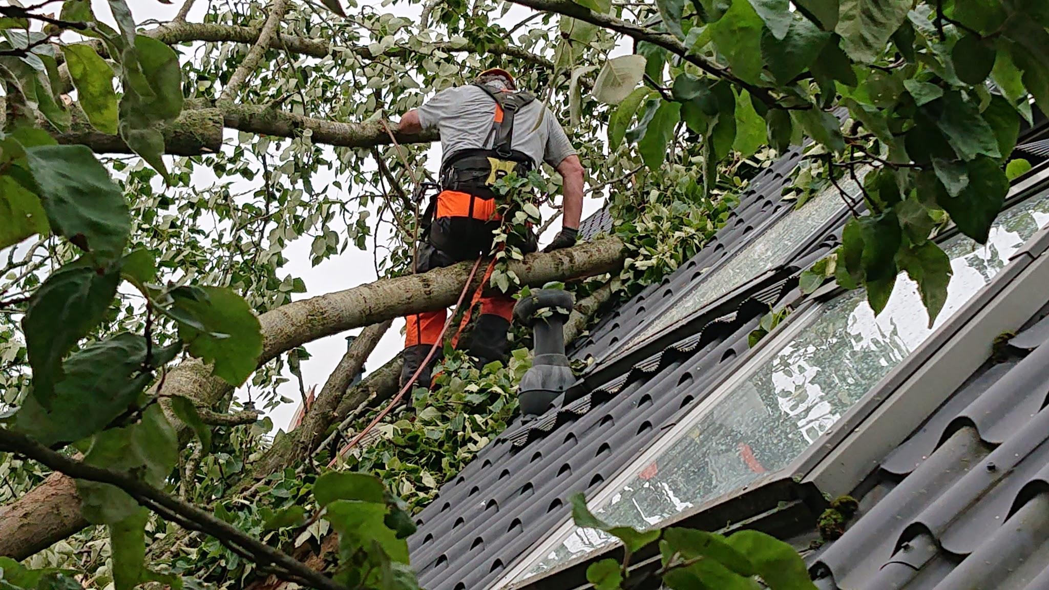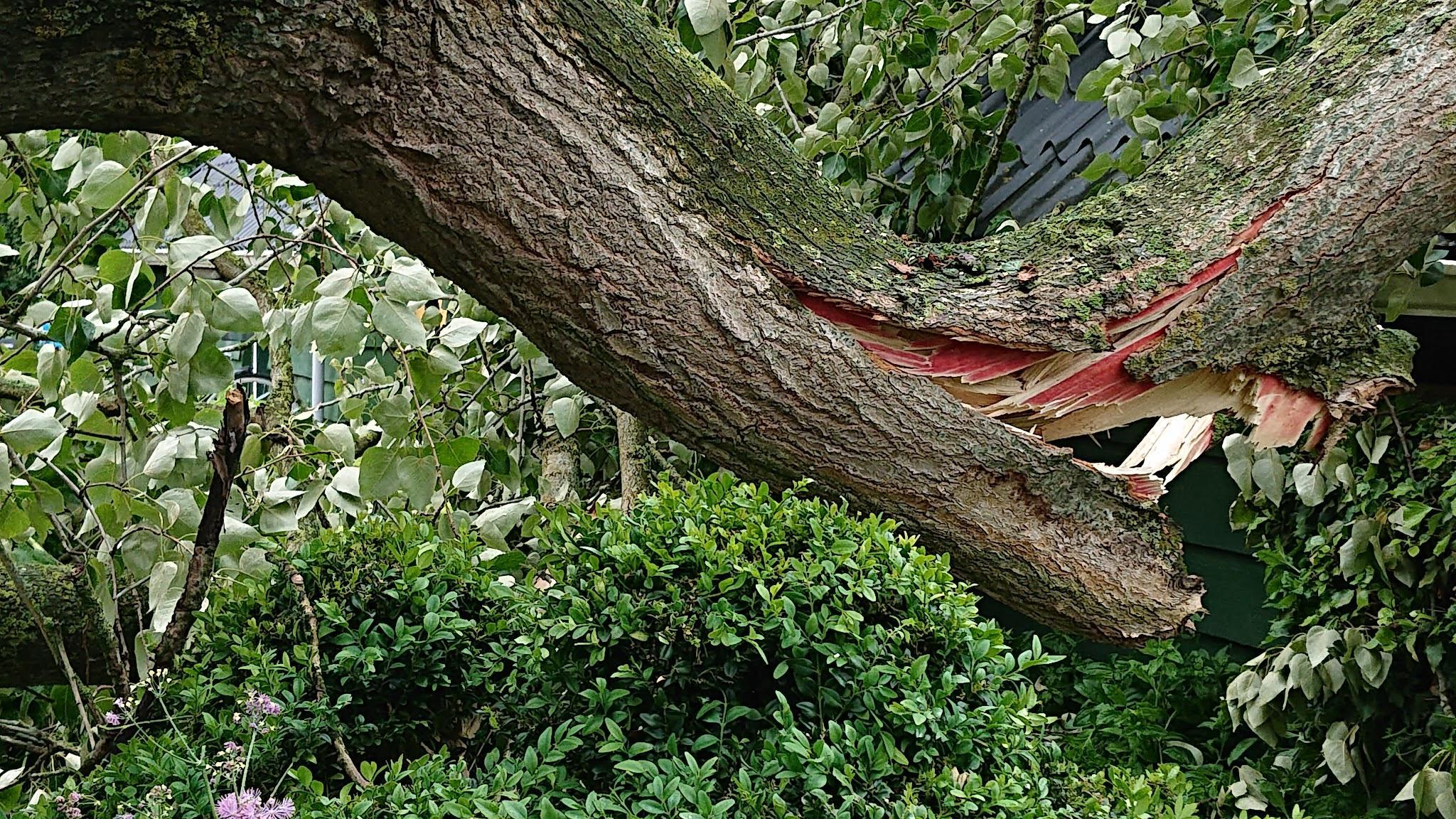 De schade aan het dak valt mee een paar deuken in de ijzeren dakplaten en een paar ramen kapot. De afgelopen dagen is een tuinbouw bedrijf bezig geweest om alles op te ruimen. Het plan is om een stuk stam van ongeveer 1.90 meter rechtop te zetten. De ontwortelde kluit wordt terug gezet in het gat en dan hopen dat hij zich weer hecht en gaat uitlopen.